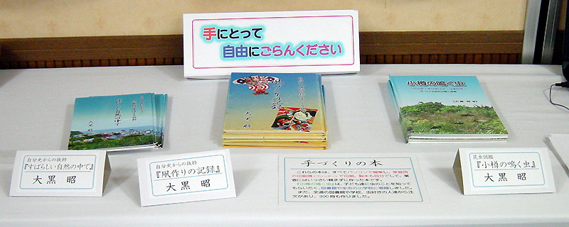 大黒昭様の「手作りの本」 左から、「すばらしい自然の中で」 「凧作りの記録」「昆虫図鑑」 |