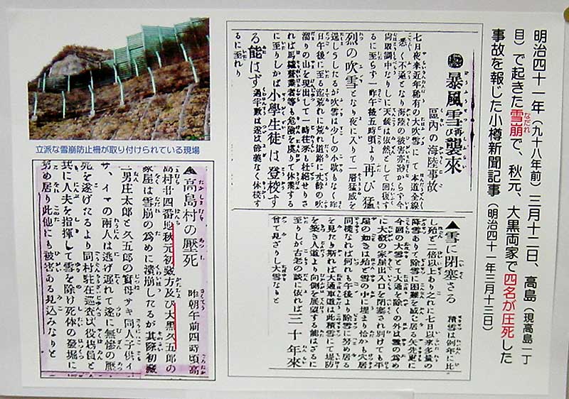 明治41年(1908)3月12日、高島で起きた雪崩で、秋元、大黒両家で