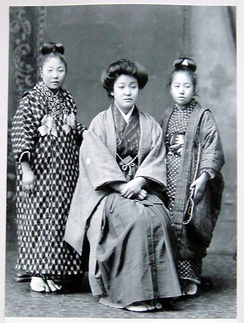 右の女性は「桃割れ」、左と中央の女性は「束髪」という髪型です。