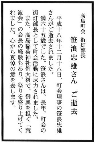 「町会 街灯部長 笹浪忠雄さん ご逝去」