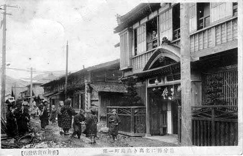 NO.1 置き屋 ― 解説 ― 明治32年頃の写真です。 1階は蕎麦屋、2階が置き屋です。 元は中一西川商店が「高島場所運上屋」を経営。 場所は現在の石谷牛乳販売店の辺りです。 ※写真提供:大黒昭様 |