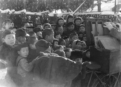 NO.4 紙芝居 ― 解説 ― 昭和20年代半ば、場所は日根工務店向かいの水産試験場跡地です(現在、高島3丁目)。 奥に見えるのは魚の干場で、写っている魚種はスケソです。 紙芝居を見るためには、紙芝居のおじさんから水飴を買わなければなりません。 演目は月光仮面や黄金バットでした。 ※写真提供:大黒昭様 |