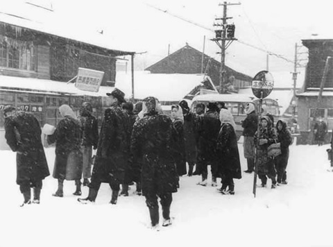 NO.5 バス亭 ― 解説 ― 昭和20年代のバス亭の様子です。 その当時はここが終点で3丁目バス停はありませんでした。 これに代わる現在の2丁目バス亭はもう少し手宮よりです。 現在、向かいにある電気屋さんはありませんが クリーニング店は営業しています。 ※写真提供:大黒昭様 |