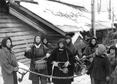 NO.6 申せ申せの出現(2-@) ― 解説 ― 画像は昭和20年代のものですが、 昭和15年発行の高島町史によりますと 昭和13年の冬、全道で50万人の感冒患者を出し、 高島も小学校が休校になるほど伝染、流行しました。 高島のオナゴショ(おばさん達)はお払いの目的で 「申せ申せ念仏申せ」と唱えながら 町内をまわりました。 ※写真提供:大黒昭様 ― 坂井肇様からの情報 ― 5〜6才の頃の記憶の中にどうにも分からないことがあったのです。 婆さん達が大勢で長いロープのようなものを持って、大きな声で「もへもへもへよ、ああもへもへもへよ」と言いながら家の中まであがってきて、全部の部屋を歩き回って出て行ったのでした。 おっかなかったと言う記憶があり、あれはいったい何だったんだろうと思っていたんですが、これなんですね。 「もへもへ」ではなくて「申せ申せ」なんですね。然し婆さん達の発音は「もへもへ」と聞こえました。 70年近い昔の記憶ですものね。 情報提供:坂井肇様(高島出身・現在 札幌在住) (貴重な情報をお寄せくださいまして、ありがとうございました。)
