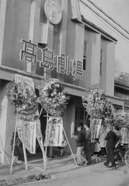NO.9 高島劇場 ― 解説 ― 昭和30年頃、経営者が代わり、そのお祝いの花輪が飾られています。 昭和25年に開館、地元青年団演劇研究会の発表の場でもありました。 私も祖母に連れられて「ゴジラ対モスラ」などの映画を鑑賞しました。 昭和30年代後半に閉館、その後、スーパーマーケットが開業しましたが、 まもなく昭和39年に撤退、 昭和40年、それまで真向かいで営業をしていた小樽信金高島支店が この跡地に移転しました。 (その後、小樽信金は平成17年10月にバス通りの寿司店跡に移転) ※写真提供:小樽市高島出身 山川初雄様 (貴重な写真を御提供くださいまして、ありがとうございました。)