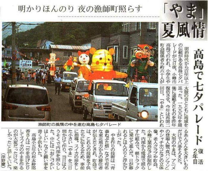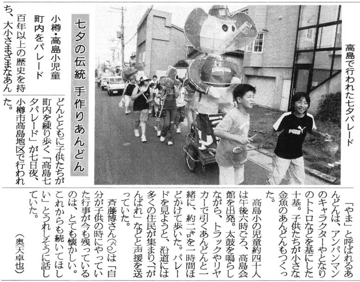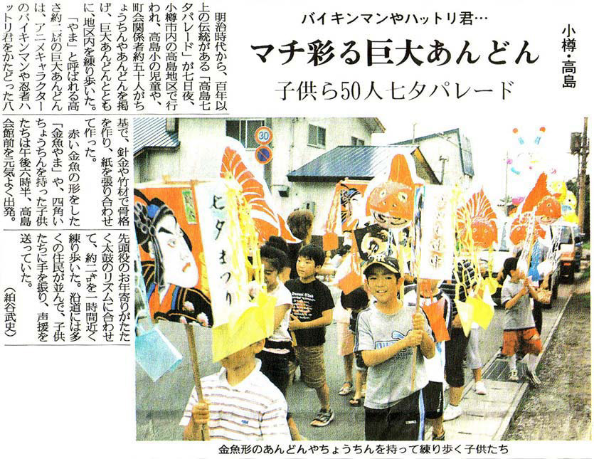 北海道新聞:2006年(平成18年)8月8日 朝刊 小樽・後志版七夕の伝統 手作りあんどん 小樽・高島小児童 町内をパレード (文・奥天卓也様) ![]() で拡大参考: ![]()