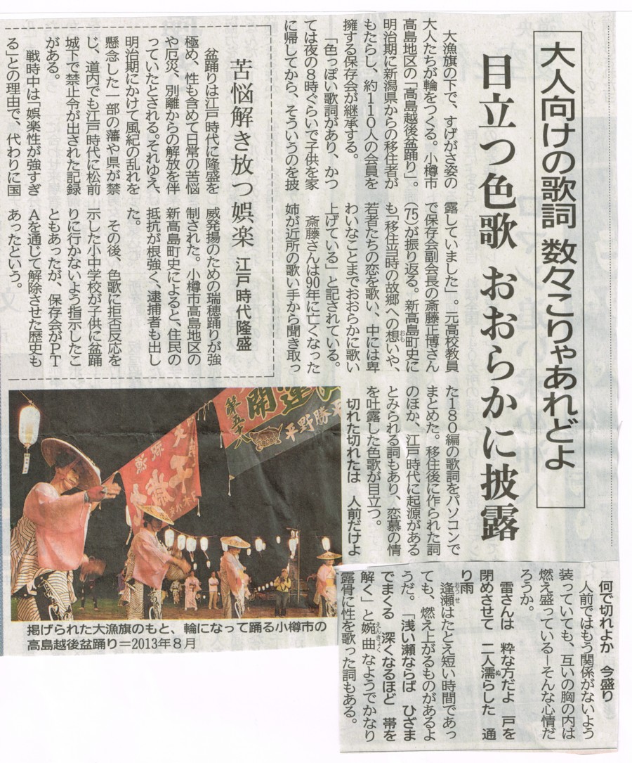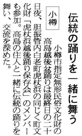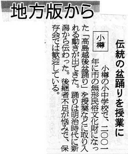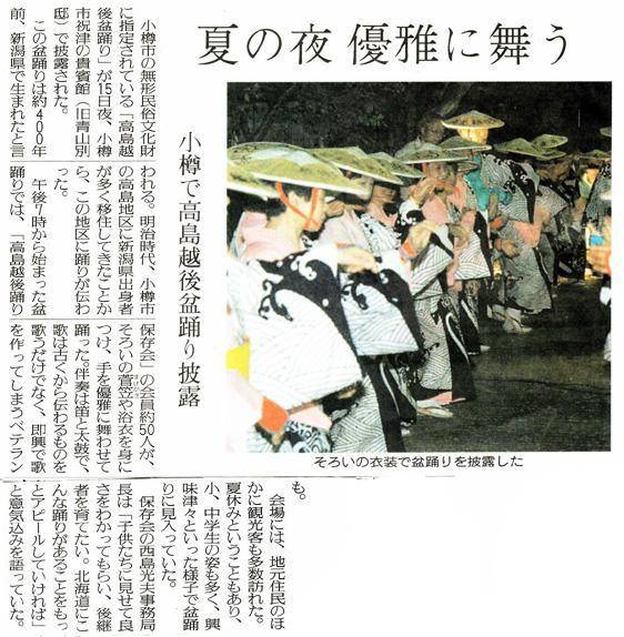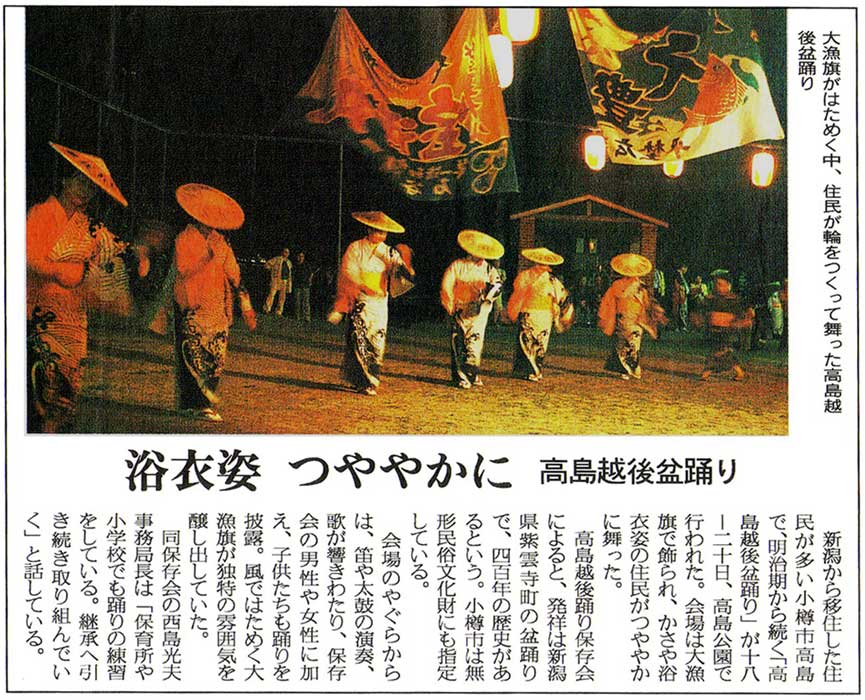 読売新聞:2005年(平成17年)8月16日 朝刊小樽で高島越後盆踊り披露 ![]() で拡大資料提供:小樽市高島町在住/佐藤隆哉様 |