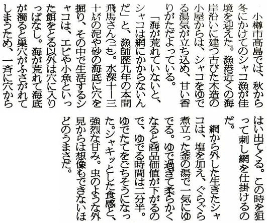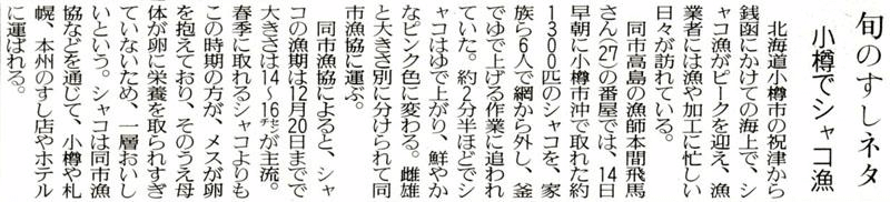 読売新聞:2005年(平成17年)11月14日 夕刊旬のすしネタ 小樽でシャコ漁 ![]() で拡大資料提供:小樽市高島町在住/佐藤隆哉様 ![]() ![]() で拡大 |