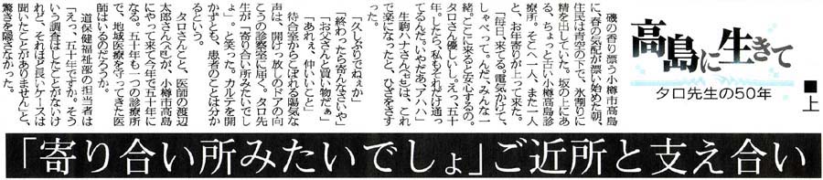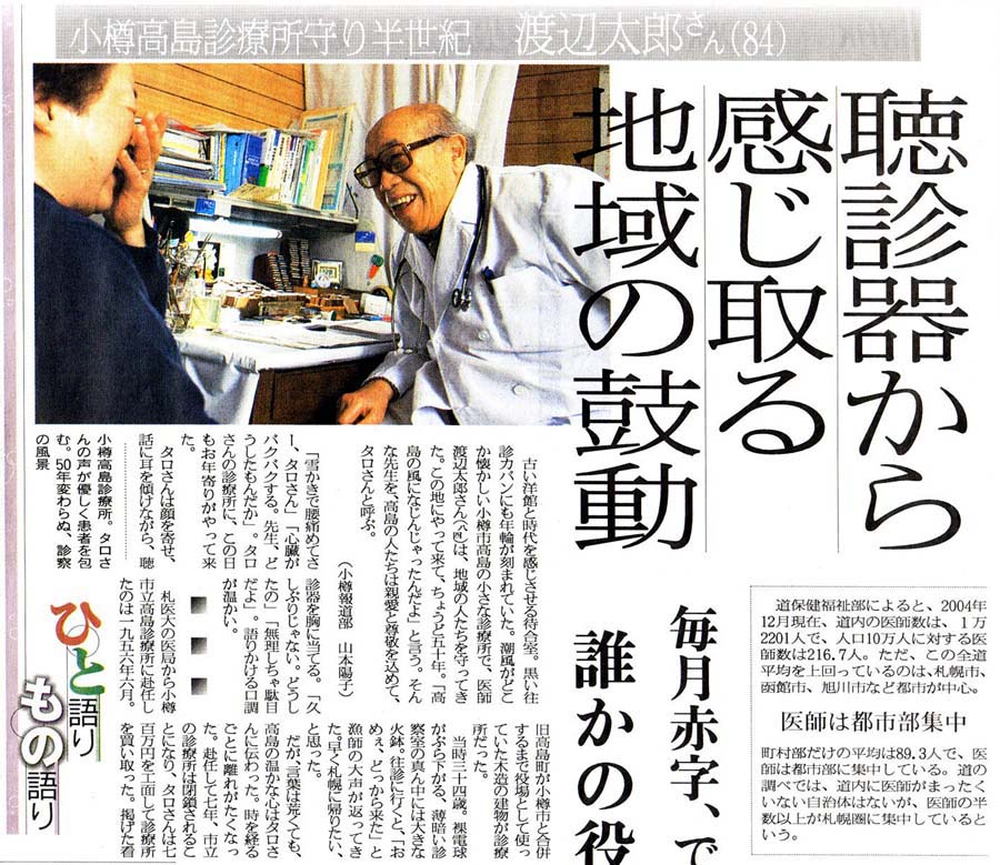ひと語り もの語り 小樽高島診療所守り 半世紀 渡辺太郎さん 聴診器から感じ取る地域の鼓動 毎月赤字、でも・・・誰かの役に立つのなら (文・小樽報道部 山本陽子様) |