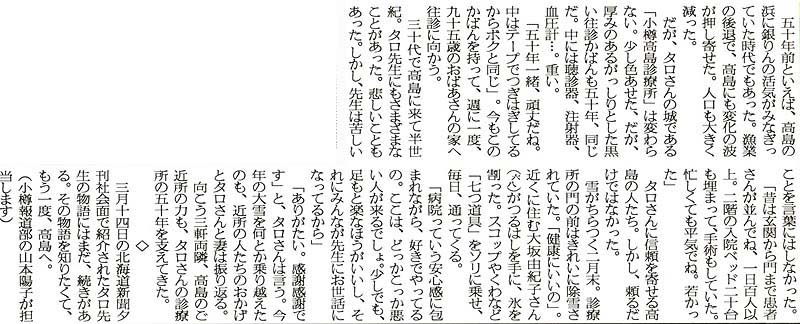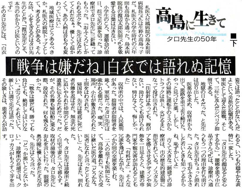 北海道新聞:2006年(平成18年)3月26日朝刊 小樽・後志版 高島に生きて タロ先生の50年<下> 「戦争は嫌だね」白衣では語れぬ記憶 (文・小樽報道部 山本陽子様) 資料提供:小樽市末広町在住/千葉哲也様 参考@: ![]()