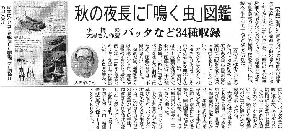 北海道新聞:2006年(平成18年)9月10日 朝刊 第2社会面秋の夜長に「鳴く虫」図鑑 小樽の大黒さん作製 バッタなど34種収録 資料提供:小樽市末広町在住/千葉哲也様 ![]() で拡大 |