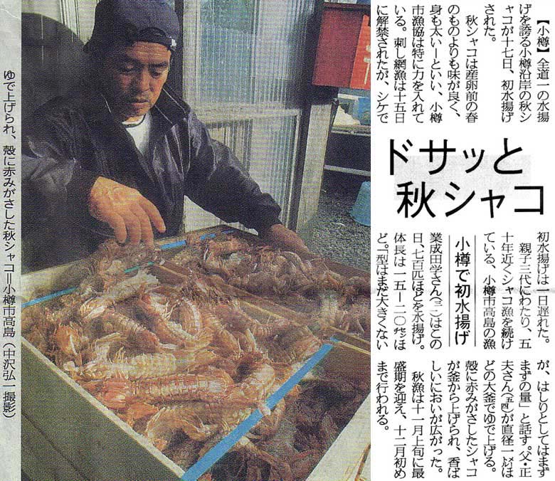 北海道新聞:2006年(平成18年)10月18日 朝刊 表一面ドサッと秋シャコ 小樽で初水揚げ ![]() で拡大 |