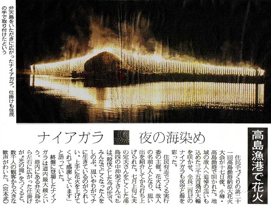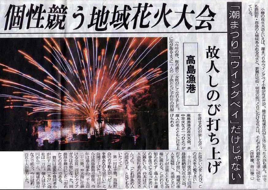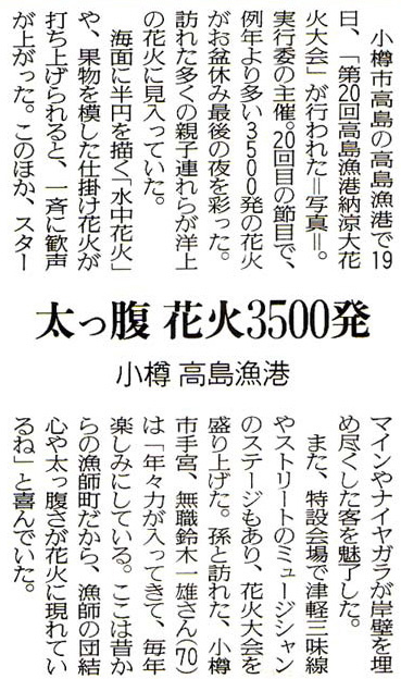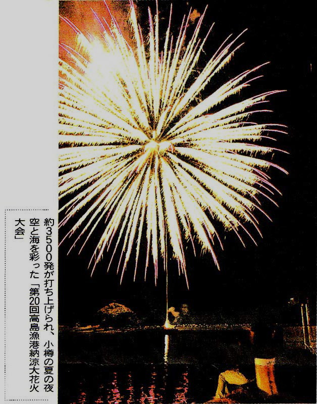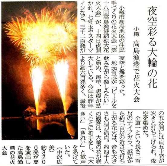 | 読売新聞:2007年(平成19年)8月21日 朝刊 太っ腹 花火3500発 小樽市 高島漁港 資料提供:小樽市高島在住/佐藤隆哉様