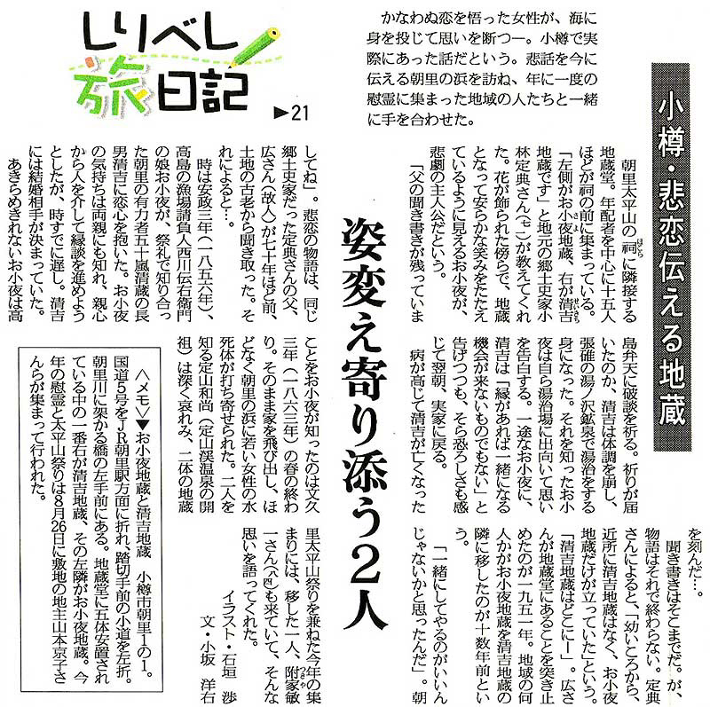 | 北海道新聞:2007年(平成19年)9月04日 夕刊 マイたうん小樽・後志 小樽・悲恋伝える地蔵 姿変え寄り添う2人 資料提供:小樽市末広町在住/千葉哲也様