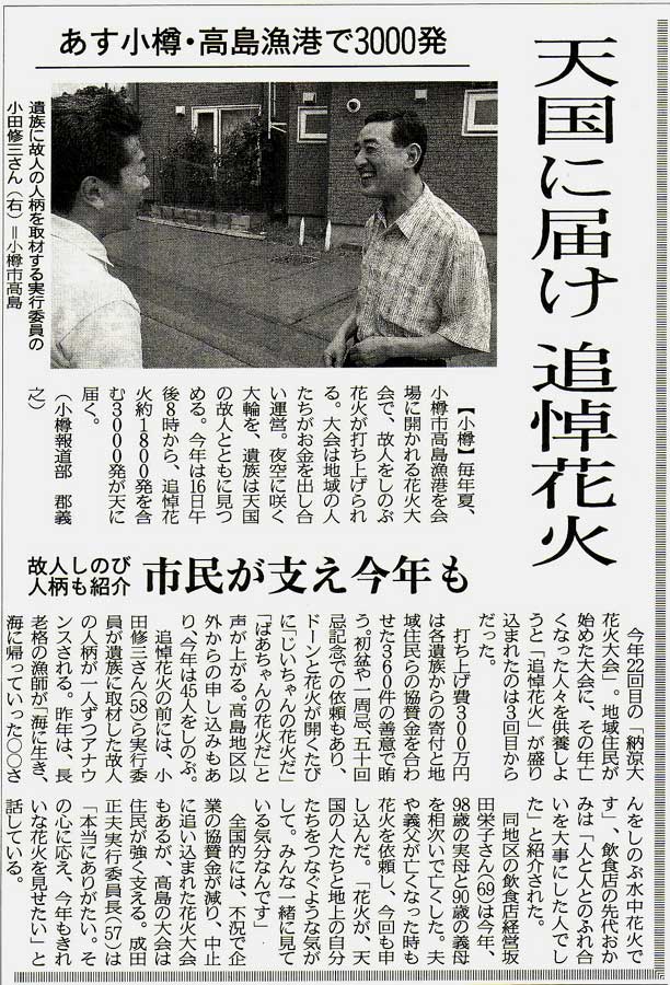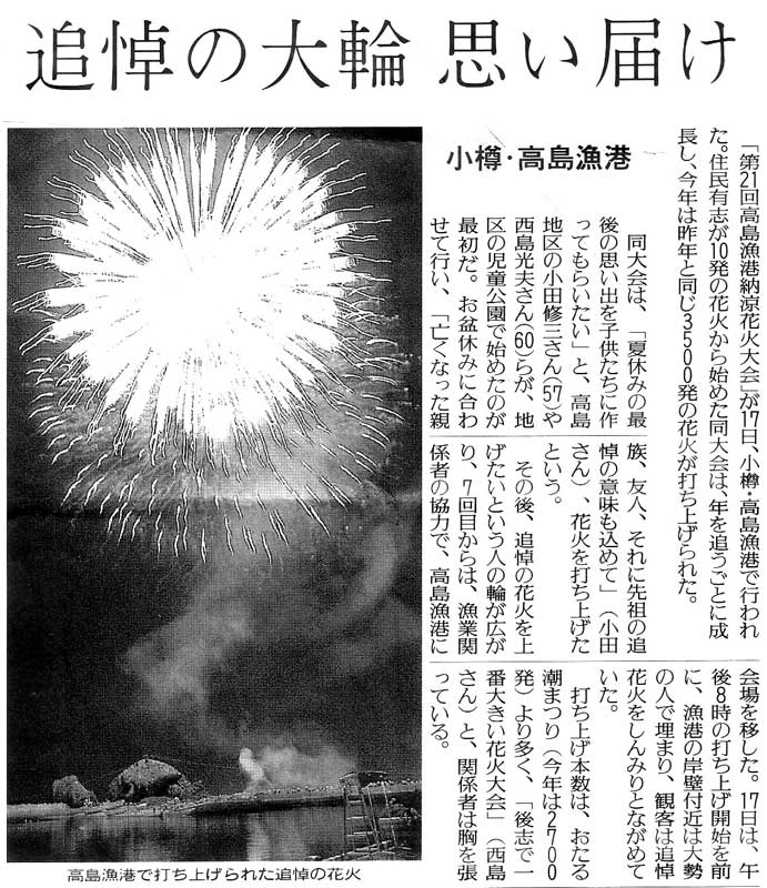 | 北海道新聞:2007年(平成19年)8月21日 朝刊 故人しのび、夜空に大輪 高島漁港で花火大会
