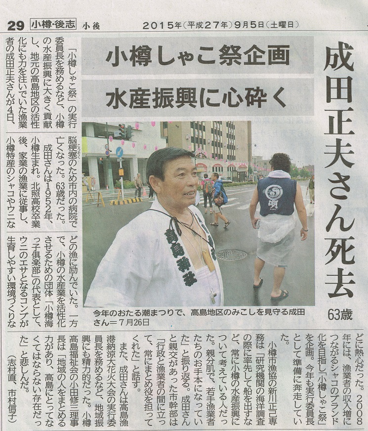 ![]() 北海道新聞:2015年(平成27年)9月5日 朝刊 小樽・後志 成田正夫さん死去 小樽シャコ祭 実行委員長 高島漁港納涼大花火大会 実行委員長 ![]() で拡大
