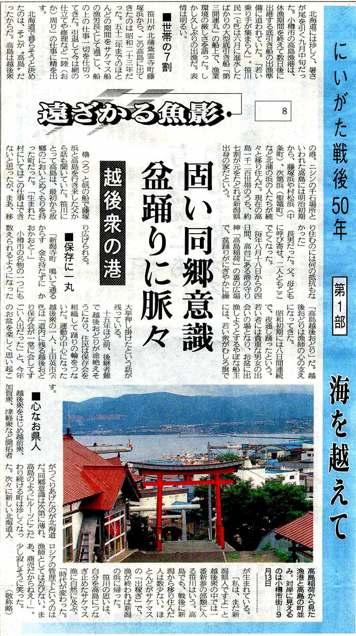 | 新潟日報:1994年(平成6年)10月2日 朝刊 にいがた戦後50年 海を越えて 遠ざかる魚影 固い同郷意識 盆踊りに脈々 越後衆の港 資料提供:札幌市在住/高橋宏幸様 ![]() |