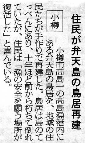 北海道新聞:2003年(平成15年)10月23日 夕刊住民が弁天島の鳥居再建 ![]() で拡大参考: ![]()