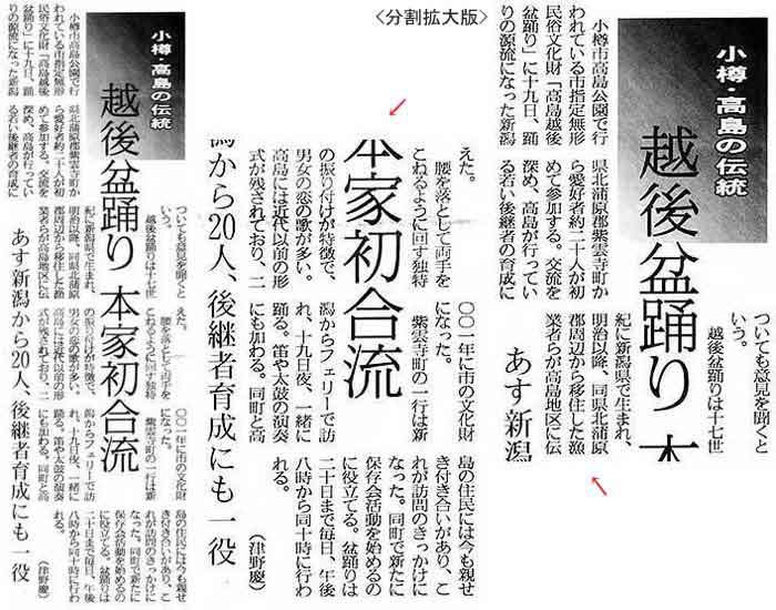 北海道新聞:2005年(平成17年)8月21日 朝刊高島越後盆踊り 本家加わり競演 ![]() で拡大資料提供:小樽市末広町在住/千葉哲也様 参考: ![]()