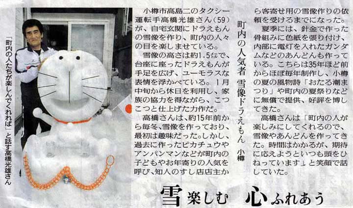 読売新聞:2005年(平成17年)2月23日 朝刊町内の人気者 雪像ドラえもん ![]() で拡大資料提供:小樽市高島町在住/佐藤隆哉様 参考: ![]()