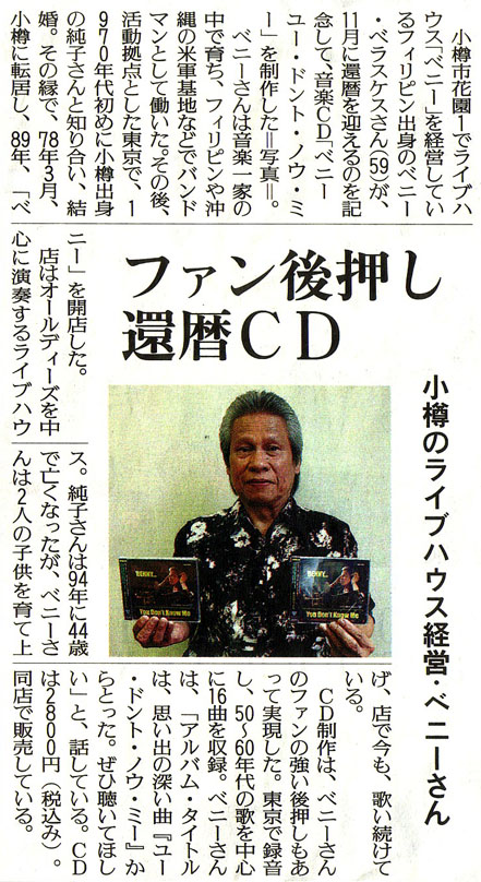 | 読売新聞:2008年(平成20年)7月25日 ファン後押し、還暦CD 高島在住ミュージシャン 小樽のライブハウス経営ベニーさん 資料提供:小樽市高島町在住/佐藤隆哉様