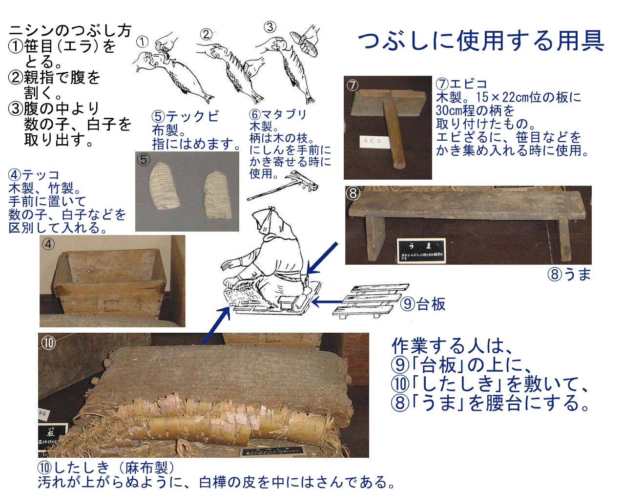 見欠ニシンを製造するために、ニシンの腹を裂いて内臓、数の子、白子、エラを除去する作業を行います。(左イラスト参照) ローカに貯蔵されたニシンは数日経過すると、柔らかくなり、作業が容易になります。 作業は早朝(こっぱやぐ)から始められました。主な働き手は地元の人々で、 出面取り(でめんとり=でめんさん)と呼ばれた出来高による賃金払いを受けた人達で、 主に女性(おなごしょ)でした。