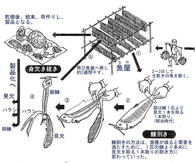割かれたニシンは更に2〜3週間、乾燥されて、身の部分を引き抜いて「見欠ニシン」となりました。