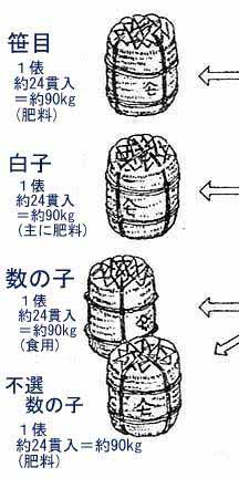 乾燥が終った笹目・白子・数の子は俵に約24貫(約90Kg)を入れて梱包しました。 俵は粕が漏れて落ちないように綿密に編まれた莚を使用しました。 笹目は肥料用として、白子は食用とすることも可能でしたが多くは肥料用として、 数の子は形状の良いものは食用として、形状の悪いものなどは別にハネておき、肥料用として出荷されました。 出荷時期は、4月後半出荷の見欠ニシンのあとでした。