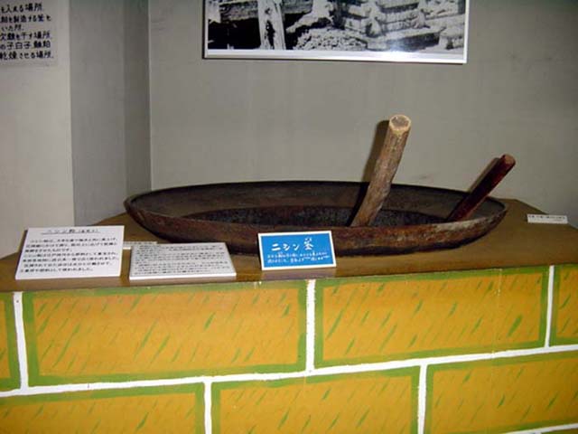 @ニシン釜と呼ばれる大きな釜でニシンを海水と共に煮上げます。