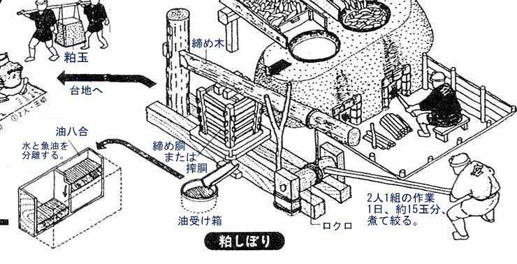 圧搾されて出た搾り汁は「油八合」という油槽に集めて、油分と水分に分離させて、油分は工業用や肥料として使われました。