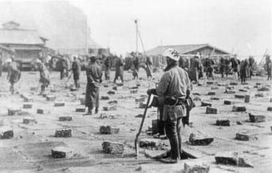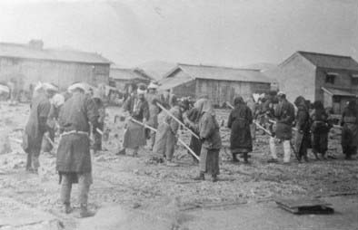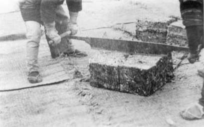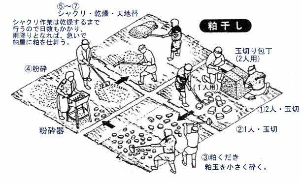 運ばれた粕玉は、莚を広げた広大な干場で切断、粉砕し乾燥されました。
