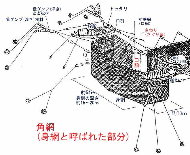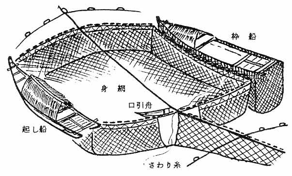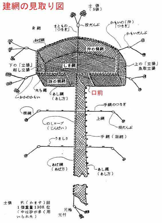 身網はカヤを逆さに吊ったような形で長さ50〜60m、幅18m位、深さ18m位のものです。