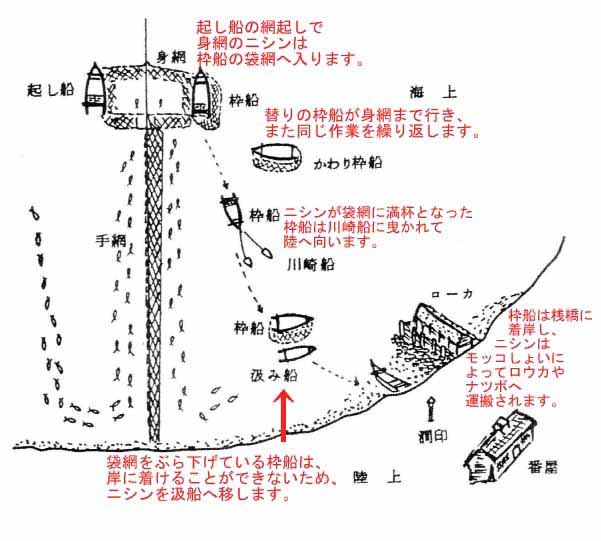 ※ニシンは沿岸に障害物等があると、また沖に向う習性があり、それを利用した漁獲方法でした。