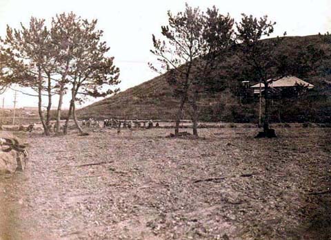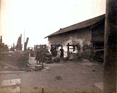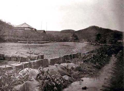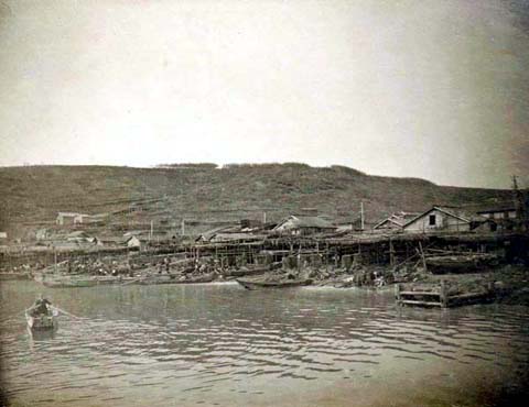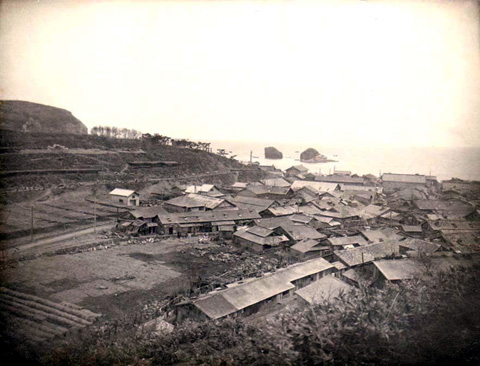 NO.1 村の様子、弁天島 ― 写真裏のメモ ― 高島郡高島村字高島漁村ノ景ナリ 遥ニ見ユル小島ノ家屋ハ 其昔北海道水産調査所ト称ヘ 国費ニ依テ経営サレツアリシガ 北海道十五年計画樹立ト共ニ 北海道水産試験場ノ事業ニ移サル