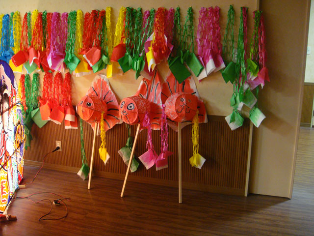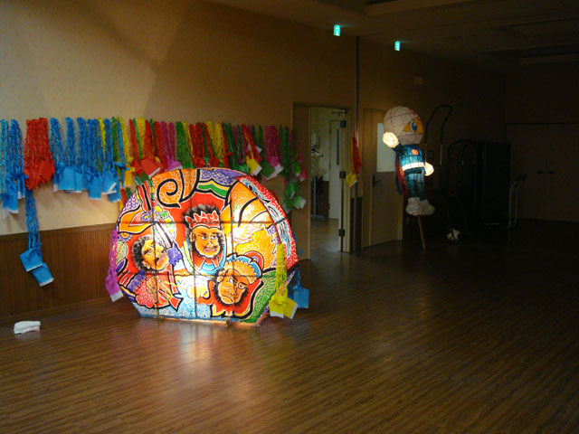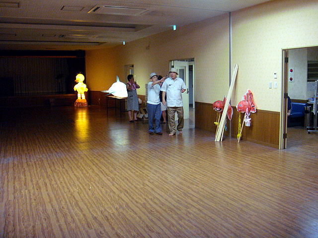 出番を待っていた山車(ヤマ)たちは一時、町民会館に展示。