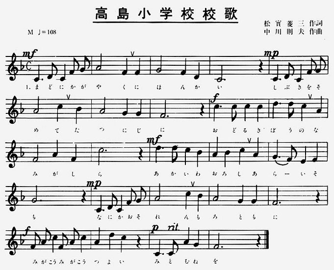 ![]() 校歌楽譜 高島小学校100周年 記念誌より抜粋 |